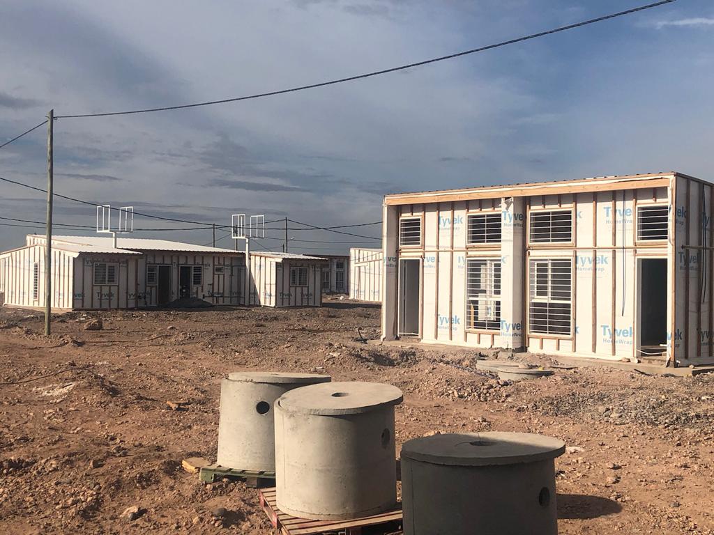 En el caso de las 100 viviendas e infraestructura, la inversión es superior a los 155 millones de pesos y el grado de ejecución es cercano al 81 por ciento. El sistema constructivo es SIP panel. Las 40 viviendas del sector D tienen una inversión estimada de 50 millones de pesos y una ejecución cercana al 62 por ciento. Se construyen a través del sistema constructivo de paneles tipo DUE. En el sector E, las 40 viviendas poseen una inversión de casi 55 millones de pesos y un avance cercano al 82,84 por ciento. También se ejecutan a través del sistema de paneles tipo “DUE”. El sistema constructivo tipo DUE consiste en paneles de polietileno con mallas de acero especial y un concreto cementicio proyectado en cada lado, con tres centímetros de espesor mínimo. Las cubiertas son de chapa sobre perfiles metálicos tipo C. El sistema SIP panel es de placas compuestas y consiste en dos caras de OSB unidas por poliuretano expandido. El sistema se completa con bordes y tirantería de cubierta de madera de pino. Las terminaciones exteriores son de placa cementicia y las interiores de placas de yeso. Las cubiertas son de la misma placa compuesta y la terminación es con chapa galvanizada. También se lleva adelante la construcción de un tanque de agua de 300 metros cúbicos que abastecerá a todo el sector de 365 lotes, esta obra lleva un avance del 42 por ciento.